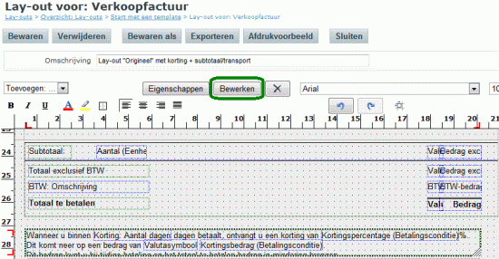 In de factuur lay-out wordt gewerkt met groene en blauwe velden. De groene velden zijn statische velden. De inhoud van deze velden komt precies zo op uw factuur, als dat ze op uw lay-out staan. De inhoud van de blauwe velden wordt uit de Exact Online administratie (database) gehaald. Hebt u bij uw klant bijvoorbeeld geen adres ingevuld op de relatiekaart? Dan wordt dit op de factuur niet getoond op de plaats waar het blauwe veld Adresregel 1 staat in de factuur lay-out. De blauwe velden zijn ook niet aan te passen op de lay-out. U kunt ze alleen toevoegen of verwijderen. De groene velden kunt u wel aanpassen. Dit kunt u doen door het veld te selecteren dat u wilt wijzigen. Vervolgens ontstaat bovenin uw scherm de knop Bewerken. Als u hierop klikt, kunt u het tekstvak aanpassen.