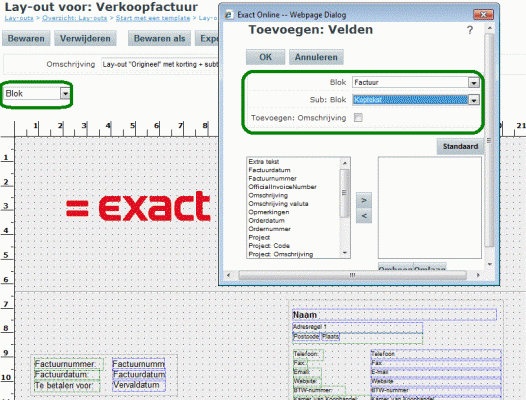 Afhankelijk van de gekozen onderwerpen kunt u velden toevoegen. In het voorbeeld is gekozen voor het Blok “Factuur” en het Sub: Blok “Koptekst”. Hierdoor kunt u velden als Factuurdatum en Omschrijving in dit blok plaatsen. Als u kiest voor het Blok Factuur voor en Sub: Blok Relatie, dan kunt u bijvoorbeeld het factuuradres toevoegen.