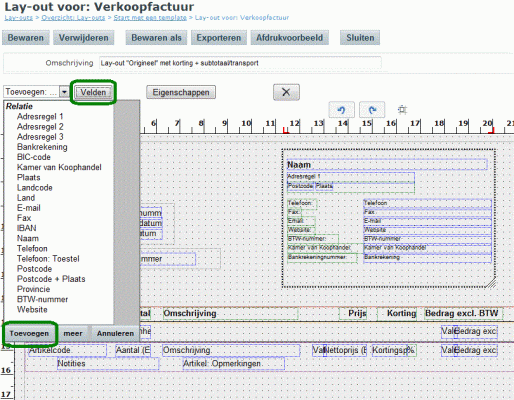 Naast het toevoegen van nieuwe blokken aan uw lay-out, kunt u ook velden toevoegen aan bestaande blokken. Dit kunt u doen door het blok op uw lay-out te selecteren. Hierdoor ontstaat een dikke stippellijn om het geselecteerde blok. Ook krijgt u de knop Velden te zien linksboven in uw scherm. Door hier op te klikken, krijgt u een lijst met beschikbare velden die u kunt toevoegen. Door het gewenste veld te selecteren en op Toevoegen te klikken, wordt het veld geplaatst in het geselecteerde blok. Doormiddel van uw muis of de pijltjestoetsen op uw toetsenbord kunt u het veld naar de gewenste plek verplaatsen. Zorg er hierbij voor dat het veld nooit buiten het blok valt. Hierdoor ziet u het veld namelijk niet op uw lay-out. Als u op Afdrukvoorbeeld klikt of de factuur echt afdrukt, komt dit veld wel tevoorschijn op uw factuur. Dit kan voor de nodige verwarring zorgen.