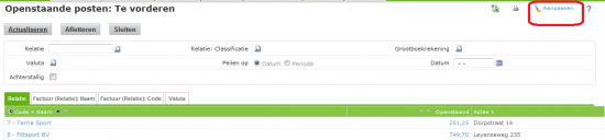 Binnen Exact Online vindt u verschillende overzichten. Deze overzichten zijn vaak toereikend, maar het kan voorkomen dat u eigenlijk een iets ander overzicht wilt. Om het overzicht aan te passen kunt u gebruik maken van de knop “Aanpassen”, deze vindt u in bijna elk overzicht/scherm. Via deze knop kunt u extra filters en kolommen toevoegen/verwijderen. Op deze manier kunt u de overzichten helemaal naar uw wens vormgeven.