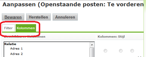 Nadat u op Aanpassen hebt geklikt opent een nieuw scherm. Dit scherm kan per overzicht verschillen. In onderstaand voorbeeld ziet u twee tabbladen. Door op deze tabbladen te klikken kunt u verschillende zaken aanpassen, zoals Filters en Kolommen.