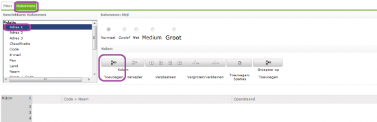 Op het tabblad Kolommen kunt u aangeven welke kolommen er getoond moeten worden. Zo kunt u bijvoorbeeld de Code Naam van een relatie als kolom weergeven, maar ook de Adresregel 1. U kunt dit doen door de kolom in het menu linksboven aan te klikken. Vervolgens klikt u op Kolom Toevoegen om de kolom toe te voegen. Nadat u de tabbladen Filter en Kolommen naar eigen wens hebt ingericht kunt u op Bewaren klikken om de wijzigingen op te slaan.