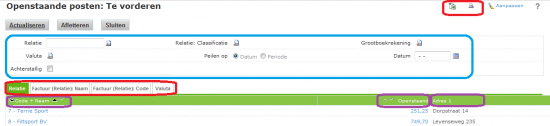 Het overzicht is na het Bewaren aangepast. In onderstaande afbeelding ziet u waar de wijzigingen betrekking op hebben. De wijzigingen op het tabblad Filter ziet u in het blauwe vak. Aan de hand van deze criteria kunt u gericht zoeken naar bepaalde openstaande posten. De wijzigingen op het tabblad Kolommen ziet u in de paarse vakken.