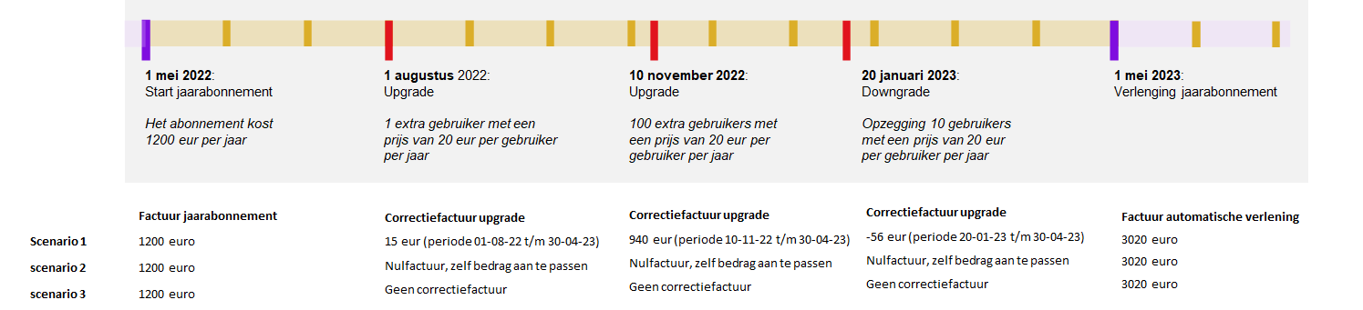 Hieronder lichten we de drie scenario’s toe. We gebruiken het voorbeeld van een langlopend jaarabonnement waarvoor een aantal tussentijdse wijzigingen gebeuren.