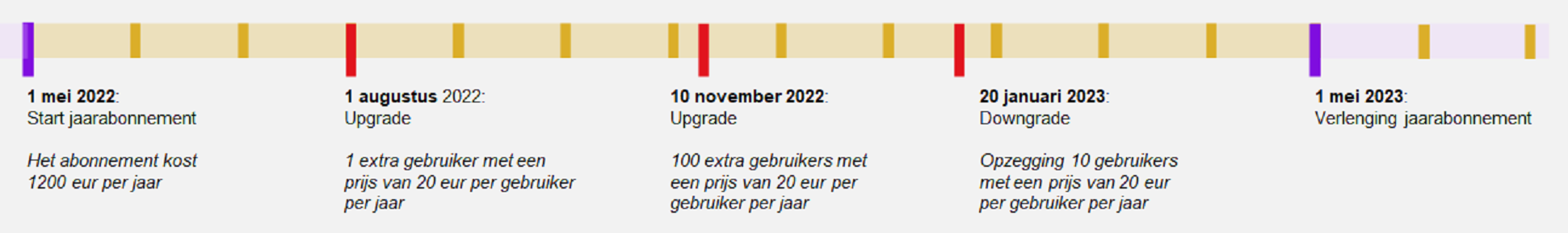 Als voorbeeld gebruiken we een jaarabonnement met ingangsdatum 1 mei 2022. Het abonnement wordt op de begindatum vooruit gefactureerd voor de periode 1 mei 2022 tot en met 30 april 2023. Er zijn drie wijzigingen in de laatst gefactureerde periode: twee upgrades op 1 augustus en 10 november 2022 en een downgrade op 20 januari 2023. U ziet de wijzigingen in de tijdlijn hieronder.