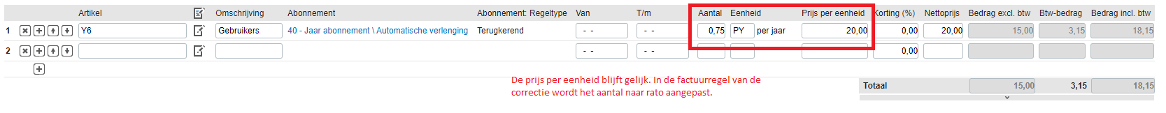 De correctiefactuur ziet er dan als volgt uit. Het aantal van 0,75 wordt gefactureerd aan de prijs van 20 euro per jaar voor die gebruiker. De upgrade wordt gedeeltelijk gefactureerd voor 15 euro.