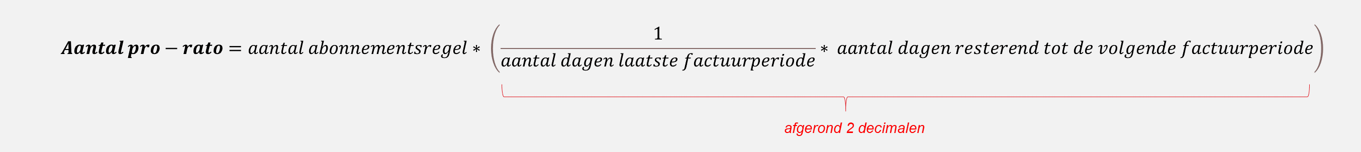 Maar hoe wordt het correctiebedrag berekend? Het is belangrijk om te weten dat in Exact Online de prijs per factuurperiode niet wordt aangepast. Stel, een abonnement kost 20 euro per jaar. Als dat tussentijds wordt gewijzigd, dan blijft de prijs 20 euro per jaar. Niet de prijs, maar het aantal wordt gebruikt om het factuurbedrag van de abonnementswijziging te bepalen. Dat pro rata aantal wordt met de onderstaande formule berekend.