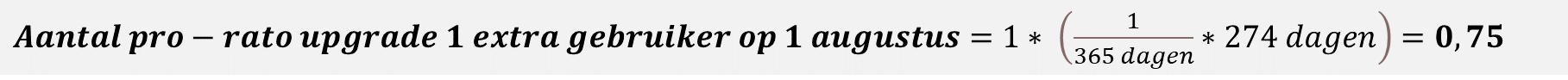 Deze aanpassing wordt gedeeltelijk gefactureerd. Uitgangspunten zijn het aantal dagen in de laatst gefactureerde periode (in dit geval 365 dagen, periode 01-05-22 t/m 30-04-23) en het aantal dagen resterend tot de volgende factuurperiode (in dit geval 273 dagen, periode 01-08-2022 t/m 30-04-2023). In dit geval is het aantal in de abonnementsregel 1 (1 extra gebruiker). Wanneer we deze in bovenstaande formule invoeren dan wordt het aantal 0,75.