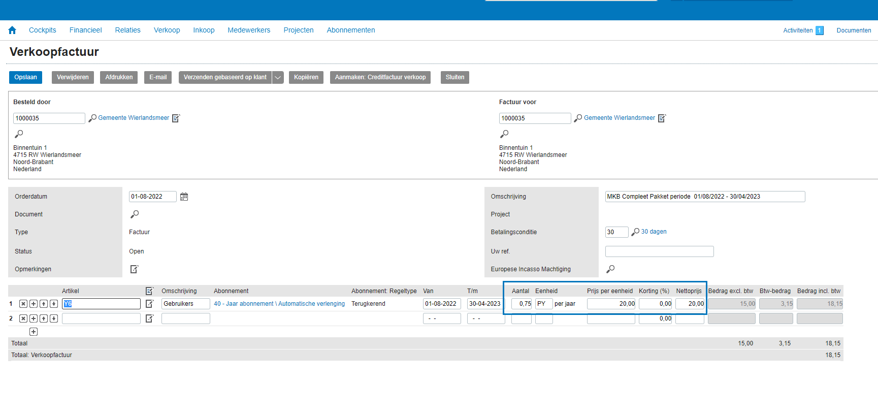 Tip! U wilt uw klant een duidelijke factuur sturen. Als u in bovenstaand voorbeeld een factuur stuurt, wilt u niet het aantal 47,47 op de factuur vermelden. Gebruik dan het veld ‘Abonnement: aantal’ – dat neemt het aantal uit de abonnementsregel over. In bovenstaand voorbeeld wordt dan niet het aantal 47,47 weergegeven, maar het aantal 101. (Zie fig. 8 hieronder)