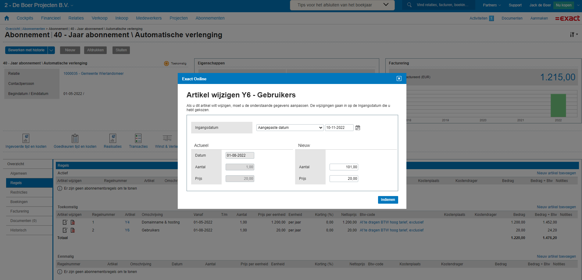 We kunnen het abonnement op twee manieren aanpassen. We kunnen een extra abonnementsregel aanmaken voor 100 gebruikers of we kunnen de bestaande abonnementsregel aanpassen: van 1 naar 101 gebruikers (zie afbeelding hieronder).
