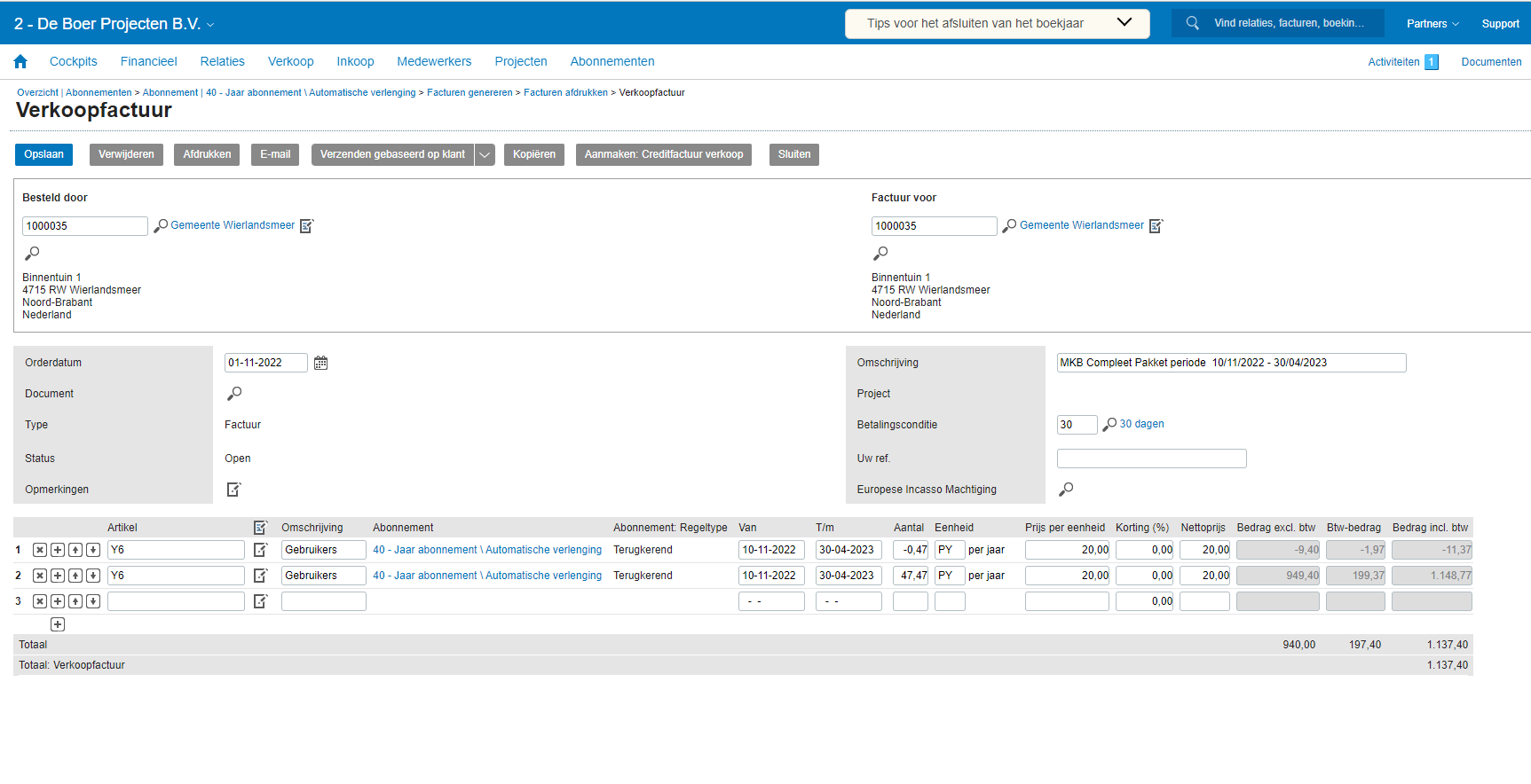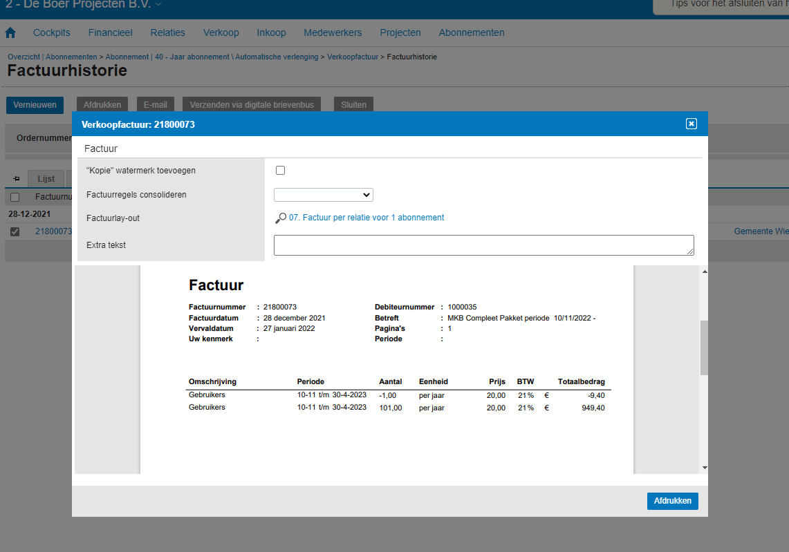 De aanpassingen in het abonnement resulteren in een correctiefactuur met een nulbedrag. U kunt dat bedrag naar wens aanpassen. Dat is vooral handig als de berekening van een wijziging niet gebaseerd is op het aantal dagen, maar bijvoorbeeld op nog te ontvangen producten (bv. magazines, maaltijdboxen).