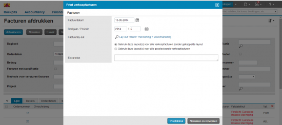 De optie ’Afdrukken’ zorgt ervoor dat u uw facturen letterlijk via de printer kunt afdrukken. Zodra u op de knop ‘Afdrukken’ klikt, krijgt u een pop-up waarin u de lay-out kunt bepalen en kunt kiezen voor ‘Proefafdruk’ of ‘Afdrukken en verwerken’. Pas als u op één van deze knoppen klikt wordt er een afdruk gemaakt en alleen wanneer u voor ‘Afdrukken en verwerken’ kiest wordt de factuur definitief gemaakt. Let op! Wanneer een factuur definitief is, is deze niet meer te wijzigen.