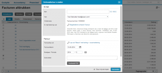 Naast het afdrukken van uw facturen via uw printer, heeft u de mogelijkheid om uw facturen per e-mail te versturen. Zodra u op ‘E-mail’ klikt opent zich opnieuw een pop-up scherm. In dit scherm kunt u aangeven welke lay-out (voor zowel de factuur als het begeleidend schrijven) u wilt gebruiken, u kunt bepalen naar welke e-mailadressen de factuur moet worden verzonden, u kunt een afzender kiezen, extra bijlages toevoegen en u kunt aangeven dat u een kopie naar uzelf wilt laten sturen. Nieuw is onder andere dat u uw factuur nu naar meerdere e-mailadressen kunt sturen en dat u contactpersonen in de velden CC of BCC kunt vermelden. Dit is echter alleen mogelijk wanneer u slechts 1 factuur wilt e-mailen. Wanneer u meerdere facturen selecteert om per e-mail te verzenden is deze optie niet beschikbaar (omdat het systeem dan niet weet welke factuur naar welk e-mailadres verstuurd zou moeten worden).