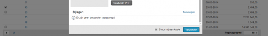 U kunt bijlages toevoegen door bij Bijlagen op Toevoegen te klikken en een gewenst document te selecteren. Houdt u hierbij rekening dat alleen documenten van het type ‘Bijlage’ geselecteerd en toegevoegd kunnen worden. Onderaan de pop-up ziet u naast de knop Verzenden de mogelijkheid om uzelf een kopie te laten versturen staan. Door hier een vinkje te plaatsen, wordt er een kopie naar uw eigen e-mailadres gestuurd, zonder dat uw adres is vermeld in de mail die de klant ontvangt. Door op de knop ‘Verzenden’ te klikken wordt de factuur verzonden en definitief gemaakt.