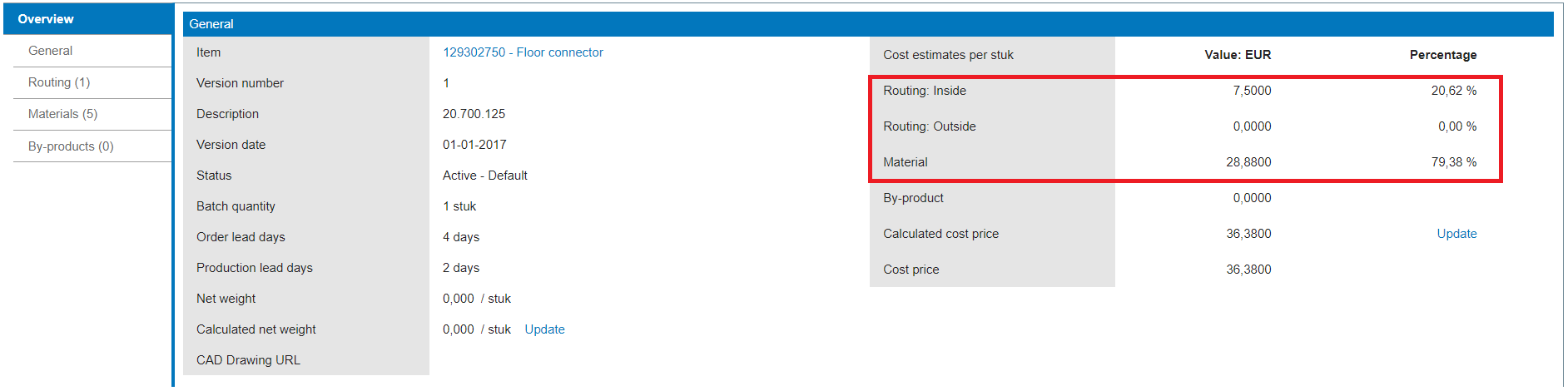 Cost breakdown on a single level In January of this year we released the ability to break down the cost price on a single level: Exact for Manufacturing Ease of Use: Cost Breakdown in the BOM. For example, we can view the cost breakdown of a “Floor connector” into 80% material cost and 20% inside routing cost: