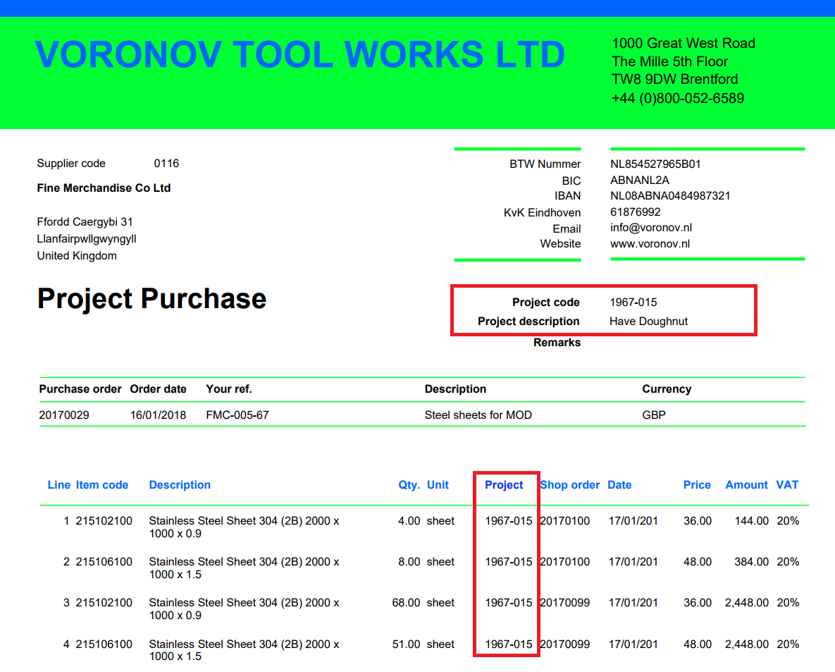 (Click to enlarge) We have added the Project Code and Project description to the purchase order header and to the purchase order lines: