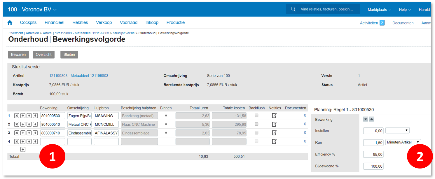 Vaak bestaat een stuklijst niet alleen uit de te gebruiken materialen maar ook uit de benodigde bewerkingen. We moeten de bewerkingen inrichten voordat we een stuklijst met bewerkingsvolgorde kunnen maken. Het stappenplan om bewerkingen in te richten kent drie stappen: ❶ We maken een Productieruimte via het pad [Stamgegevens] Productie, Productieruimtes. Denk bij een productieruimte aan een afdeling zoals spuitgieten of assemblage. We kunnen aan de productieruimte een aantal grootboekrekeningen koppelen. Zonder deze worden er geen productiekosten geboekt! De meeste productiebedrijven vullen alleen de rekeningen voor Arbeid toegerekend en Machinelast toegerekend in. Arbeid toegerekend is de dekking voor kosten van arbeid, en Machinelast toegerekend is de dekking voor de kosten van afschrijving, onderhoud en energiegebruik van machines. ❷ Nu kunnen we een of meer Bewerkingsstations aanmaken via [Stamgegevens] Productie, Bewerkingsstations. Een bewerkingsstation is een machine of productielijn zoals een CNC machine, een spuitgietmachine of een montage cel. We koppelen het Bewerkingsstation aan de/een Productieruimte, en we vullen de kosten per uur in. Bij arbeid kunnen we een onderscheid maken tussen Instelarbeid en Runarbeid, bij Machinelast wordt het uurtarief voor zowel instel- als runactiviteit gebruikt. De tarieven zijn belangrijk voor de voor- en nacalculatie. ❸ Tenslotte kunnen we één of meerdere Bewerkingen inrichten die we koppelen aan de Bewerkingsstations. Bij bewerkingen kunnen we denken aan het boren van een gat, het snijden van een plaat of een activiteit als kwaliteitscontrole. We kunnen eventueel een standaard duur (tijd) inrichten, en een tekst met instructies voor de werkbon voorbereiden.