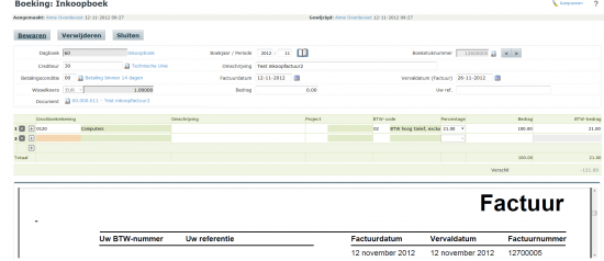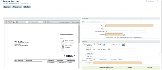 U ziet nu aan de linkerkant uw factuur staan. Aan de rechterkant kunt u de gegevens invullen. Dit zijn bijvoorbeeld de crediteur, omschrijving en de boekingsregels.