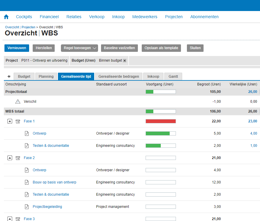 De WBS kun je ook gebruiken om de kosten en uitgaven te bewaken. Deze gaan we ook in de komende tijd verder verbeteren, zodat je bijvoorbeeld nog eenvoudiger een inkooporder op basis van een begrote uitgave kunt vastleggen.