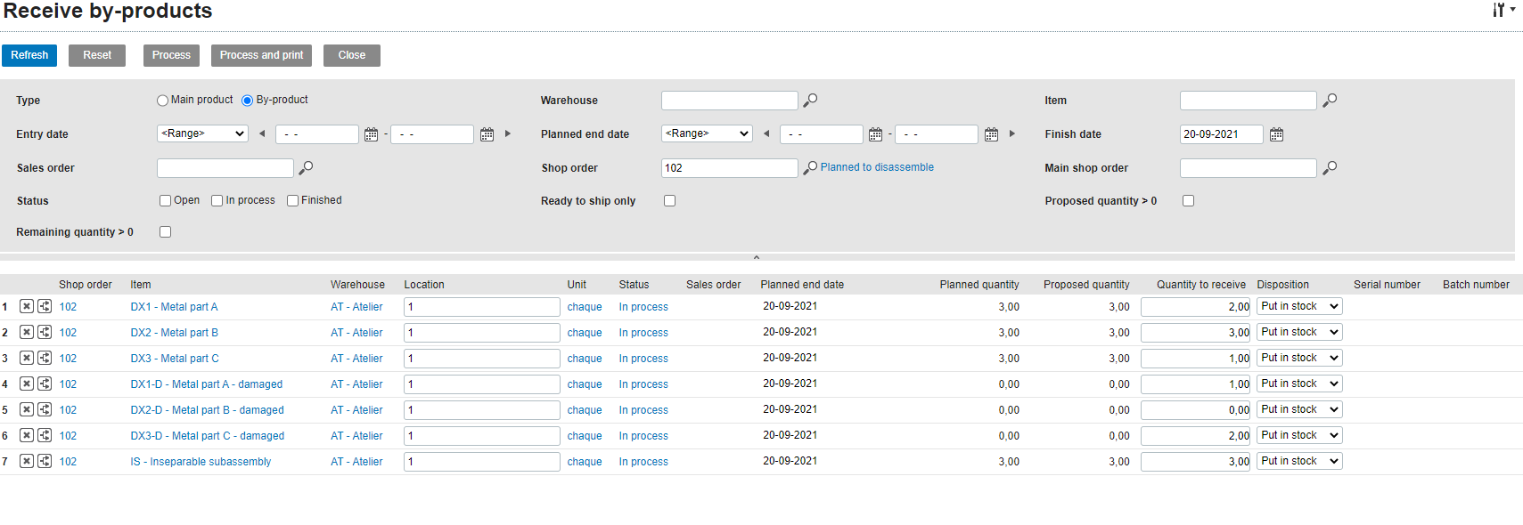 We can register the output of the disassembly work and put disassembled items on stock. In this case we received both damaged and non-damaged parts. Please note that in this case we only use one stock location. Of course, you can work with various stock locations, helping you to separate damaged from non-damaged parts.