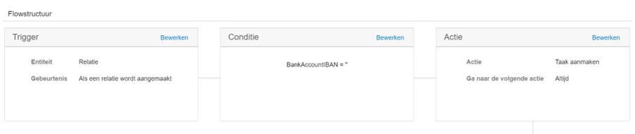 Met Automate is het mogelijk direct geïnformeerd te worden over gebeurtenissen die jij belangrijk vindt die in Exact Online hebben plaatsgevonden. Het tweede concrete voorbeeld is dat wanneer er een nieuwe relatie wordt aangemaakt en het bankrekeningnummer leeg is, er dan een taak voor de accountmanager wordt aangemaakt om te bellen:
